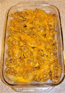 Once the shells have cooled enough to touch you will spray a 9x13 pan with cooking spray. Take 1 shell at a time and using a table spoon thoroughly fill each shell. If you have a little extra filling just place it on top of any shells that seem to be not quite a full. You can see how I have arranged them in the pan below.